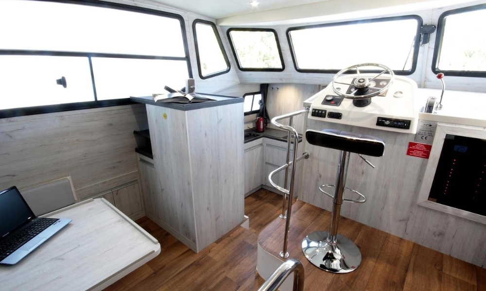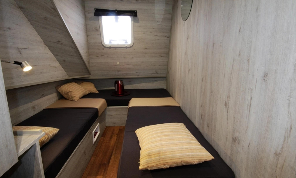 Sehr komfortables Boot mit 4 Kabinen, davon zwei Doppelkabinen – wandelbar in je 2 Einzelbetten, zwei Doppelkabinen mit festem Doppelbett. 3 x DU/ WC. Stilvoller, komfortabler Salon mit getönten Panoramafenstern und Klimaanlage, Sitzecke kann zu einem Doppelbett umgebaut werden.
