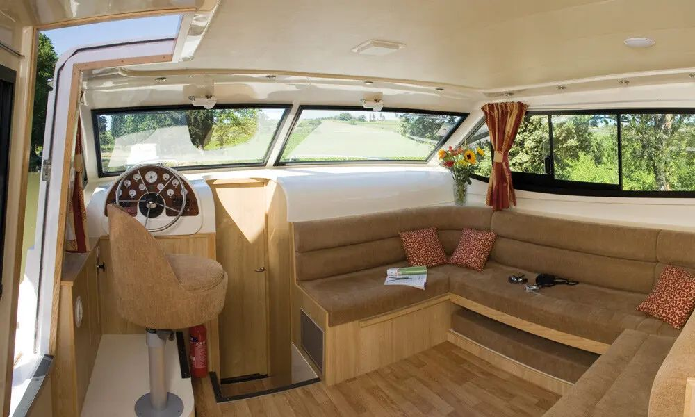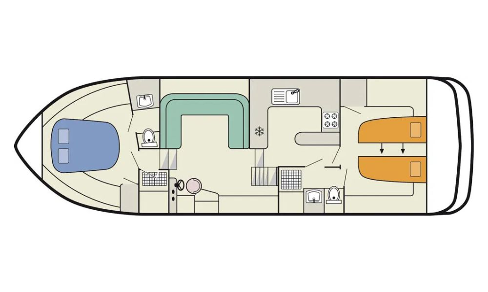 Das Hausboot Europa 400 ist perfekt für 4 Personen. Es hat insgesamt 2 Kabinen mit eigenem Bad (mit Dusche und WC), jeweils eine in Bug und Heck.