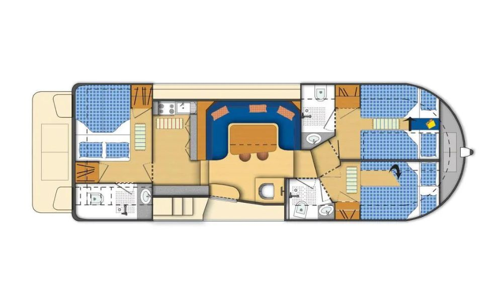 Das Hausboot Europa 400 ist perfekt für 4 Personen. Es hat insgesamt 2 Kabinen mit eigenem Bad (mit Dusche und WC), jeweils eine in Bug und Heck.
