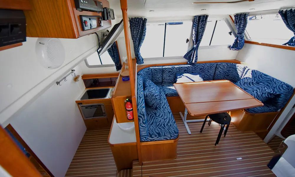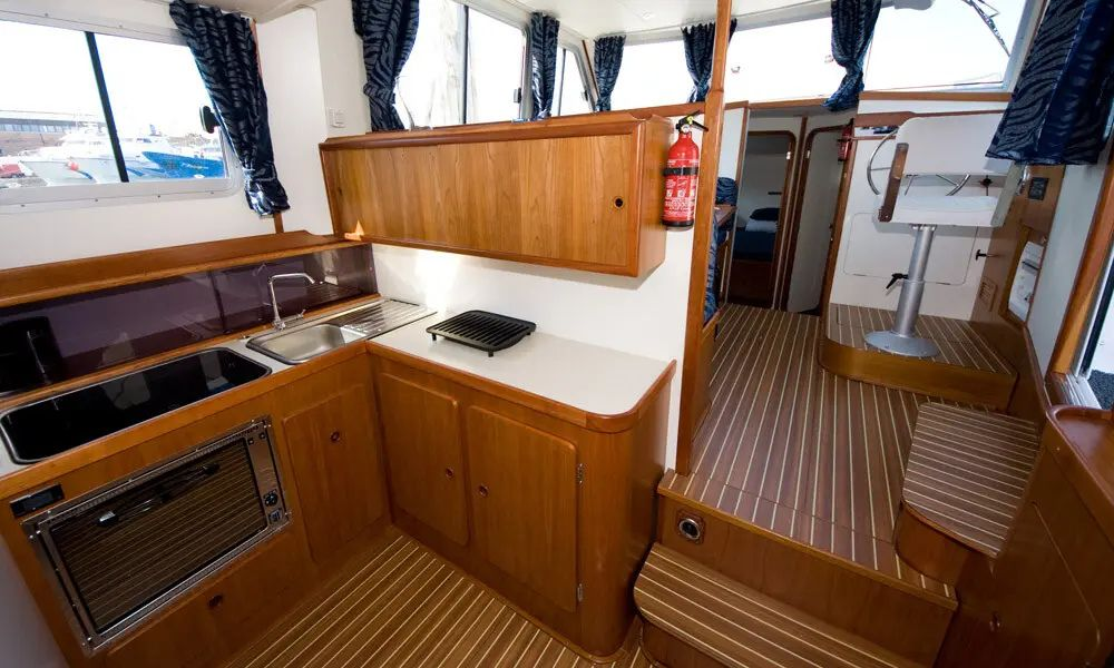 Kompaktes Boot mit 3 Doppelkabinen und 3 x DU/WC. Salon mit Esstisch und angrenzende Küche. Diese ist komplett ausgestattet mit Gasherd, Spüle, Kühlschrank, Kochutensilien und Geschirr. Innen-und Aussensteuerstand, Aussendeck Sitzmöbeln und Sonnensegel, Badeplattform im Heck. Bugstrahlruder, 220V Stromanschluss, Heizung.